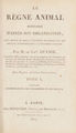 Le règne animal distribué d'après son organisation. Pour servir de base à l'histoire naturelle des animaux et d'introduction à l'anatomie comparée / par M. le cher, Cuvier ... Avec figures, dessinées d'après nature.