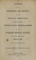 Address on the progress and dignity of the medical profession : delivered before the trustees, faculty, students and friends of the Starling Medical College at its annual commencement, February 17, 1849 / by B.T. Cushing.