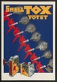 Shelltox (Shell Tox) insecticide: red men spraying it at insects, and below examples of branded cans and sprays. Colour lithograph, 19--.