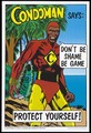 Condoman, a cartoon figure, holds a packet of condoms on a beach; advertising safe sex among indigenous Australians. Colour lithograph by the Department of Health, Housing and Community Services, Australia, and the Aboriginal Health Workers of Australia (Queensland).