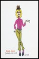 A skinny man wearing a frilly pink shirt, striped trousers and heels (?), while smoking. Colour process print after Nertz, 196-.