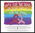 A red and pink ribbon against a rainbow of colours and a quotation from Mother Jones to pray for the dead and fight for the living; with an advertisement by the Syracuse Cultural Workers. Colour lithograph by Amy E. Bartell, 1995.