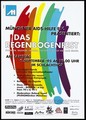 Multicoloured vertical painted lines with details of 'Das Regenbogenfest' [The Rainbow Festival] on Saturday 9 September 1995 at the Slaughterhouse [in Munich], an event organised by the Munich AIDS-Hilfe. Colour lithograph.