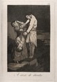 A woman covers her eyes as she steals the teeth of a hanged man. Aquatint with etching by F. Goya, ca. 1797.