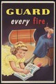A log fire with a guard in front, which a little boy touches with his rattle. Colour lithograph.