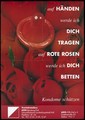 A red condom among red roses with German text: "With my hands I will support you, on red roses I will bed you. Condoms protect."; an advertisement for safe sex by the AIDS counseling Kiel and AIDS-Hilfe Kiel e.V. Colour lithograph.