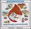 A blood droplet containing an illustration of a wounded patient in bandages lying in a hospital bed receiving a blood transfusion; surrounded by images of war-torn villages and violence; an anti-AIDS advertisement. Colour lithograph, ca. 1997.