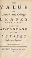 Tables for renewing and purchasing of the leases of cathedral-churches and colleges, according to several rates of interest, with their construction and use explain'd. Also tables for renewing and purchasing of lives. With tables for purchasing the leases of land or houses. According to several rates of interest / [Anon.] Very necessary and useful for all purchasers, but especially those who are in any way concerned in church or college leases. To which is added, The value of church and college leases consider'd [by Thomas Manningham] And the advantage of the leases made very apparent.