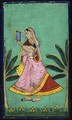 An Indian lady looking at herself in a mirror. Gouache painting by an Indian painter.