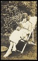 A sailor in drag, wearing a long coat and hat, sits reading in a garden. Photographic postcard, ca. 1920.