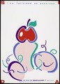 A red apple forming the tip of a penis with a quote from Albert Camus: 'La felicidad es generosa ... no vive de destrucción' [Happiness is ... generous destruction of lives] and the letters 'SIDA' in each corner; advertising the danger of AIDS. Colour lithograph by Santiago Pol, 1994.