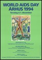A naked figure stands with arms and legs splayed watched by onlookers, a painting by Henriette Kyed; an advertisement for music events to mark World AIDS Day on 1st December 1994 organised by the Stop AIDS campaign, Århus Kommune, AktHIVhuset and Aarhus County, Denmark. Colour lithograph, 1994.