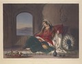 A wealthy Afghan lady reclining and smoking a hooka. Coloured lithograph by R. Carrick, c. 1848, after J. Rattray.