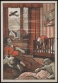 A family (two adults and two children) lying dead in a room in their house as a result of poison gas emitted from an aeroplane flying overhead. Colour lithograph, 192-.