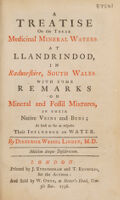 A treatise on the three medicinal mineral waters at Llandrindod, in Radnorshire, South Wales. With some remarks on mineral and fossil mixtures, in their native veins and beds; at least as far as respects their influence on water / [Diederick Wessel Linden].
