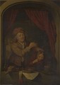A tooth-drawer holding up a tooth after extracting it from a patient, who is spitting blood out of the window. Coloured lithograph by J.A.(?). Pecht, 1836, after G. Dou, 1672.
