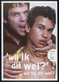 A gay man embracing a younger Asian man, with a statement on the need for safe sex. Colour lithograph by Gebr. Silvestri for the Schorerstichting, 2001.