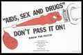 A couple kissing within a syringe from which a drop of liquid containing a fetus is released with a warning about the risk of sex, drugs and AIDS; advertisement for the Louisiana AIDS hotline. Colour lithograph.
