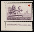 [Single, 'stamp' gummed sticker celebrating the stamp centenary exhibition and "sold in aid of the Lord Mayor's Red Cross and St. John Fund." Printed in purple].