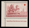 [Single, 'stamp' gummed sticker celebrating the stamp centenary exhibition and "sold in aid of the Lord Mayor's Red Cross and St. John Fund." Printed in magenta].