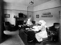 Ambulance Column depot, 9 Gower Street, London: the Deputy Director seated at his desk. Photograph, September 1918.