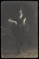 A British prisoner of war in drag, wearing a delicate short dress, leans towards the viewer with his hands on his hips. Photographic postcard by E. Ohle, 191-.