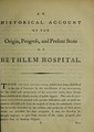 An historical account of the origin, progress, and present state of Bethlem Hospital. Founded by Henry the eighth, for the cure of lunatics, and enlarged ... for the reception and maintenance of incurables / [Thomas Bowen].