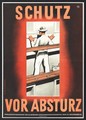A house painter on a platform with a waist-high crossbeam to prevent an accidental fall. Colour lithograph by A. Th. Schwarz, ca. 1957.