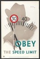 A man, seen in silhouette wearing a hat, driving a car, the speedometer of which is going over the 30 miles per hour mark which is in the form of a road sign indicating the speed limit. Colour lithograph after Pat Keely, 1947.