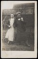Two Dutch men dancing together, accompanied by an accordionist. Colour photographic postcard, 190-.