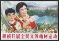 China during the Cultural Revolution: children and young people setting off to plant trees and dig reservoirs for the Chinese people. Colour lithograph, ca. 1970.