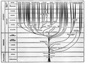 M0001300: Illustration charting the development of life through three geological periods (broadly categorised as the "Palaeozoic", "Mesozoic" and "Cenozoic" periods)