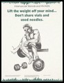 A weight-lifter sits on a bench with his weights at his side as someone offers him a steroid injection; a warning not to share vials and used needles for steroids; advertisement for The Steroid Project as part of the Kingston AIDS Project funded by the National AIDS Strategy, Health Canada. Colour lithograph by Alice Whissell.