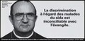 Cardinal Henri Schwery, Bishop of Sion, wearing glasses with the message in French: "Discriminiation of AIDS patients is irreconcilable with the gospel."; one of a series of posters from a Solidarity 'Stop AIDS' campaign by the l'AIDE Suisse contre le SIDA in collaboration with the Federal Office of Public Health. Colour lithograph.