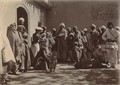 A 'kuttar' or line of blind beggars in a row, two other men in discussion, Kabul, Afghanistan. Coloured lithograph after L.W. Hart, 1843.