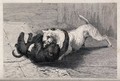 A dog with a dappled coat is trying to touch a hot object that is lying on the ground with its paw. Etching by A. Ashley.
