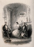 A young women sits reading a sheet of paper while one man listens attentively and the other looks away. Etching by A. Ashley.
