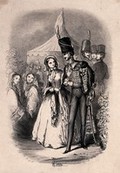 A soldier with a young woman on his arm is watched with interest by those around them. Etching by or after A. Ashley.