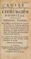 Suite du Chirurgien d'hôpital, contenant differens traitez, du mercure, des maladies des yeux & de la peste, des tumeurs enkistées; des boutons du visage; des playes de poitrine; des playes tortueuses; des injections; du mot d'escarre; de la chute de l'intestin dans le scrotum; du sarcocele & miserere ... / [Augustin Belloste].