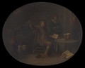A physician-alchemist examining a urine flask. Oil painting by a follower of David Teniers the younger.