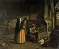 A lady visiting an alchemist in his laboratory. Oil painting attributed to Jan Josef Horemans, 17--.