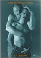 Two bare-chested men wearing jeans and moustaches hold each other with the message in German: "My friend is [HIV] positive. I love him"; an advertisement by the Deutsche AIDS-Hilfe e.V. Colour lithograph by I. Taubhorn and W. Mudra.