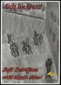 People huddled together within prison walls edged with barbed wire with a lone figure bottom right suggesting the social isolation of someone who has AIDS; an advertisement for the information line for those affected by AIDS in prison by Deutsche AIDS-Hilfe e.V. Colour lithograph.