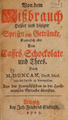 Von dem Missbrauch heisser und hitziger Speisen und Geträncke, sonderlich aber des Caffes, Schockolate, und Thees ... / aus der frantzösischen in die hochteutsche Sprache übersetzt.