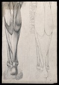Muscles and tendons of the lower leg and foot, seen from behind: two figures showing both stylised outline and detailed drawing. Pencil drawing by or associated with A. Durelli, ca. 1837.