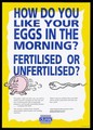 A spermatozoon chasing an egg, as an advertisement for condoms as a protection against unplanned pregnancy. Colour lithograph, 1994.