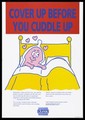 A personified penis wearing a condom in bed to illustrate the use of condoms as a protection against unplanned pregnancy and sexually transmitted diseases including AIDS. Colour lithograph, 1994.