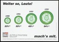 A customised bar chart with four green condoms instead of bars representing increased condom use in Germany between 1988 and 1996; representing protection against AIDS. Colour lithograph after M. Kolvenbach and G. Meyer, 199-.