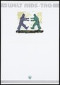Two people walking towards each other with their arms outstretched; representing solidarity with AIDS victims on World AIDS day. Colour lithograph, 199-.