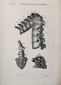 Three examples of diseased spine, numbered for key. Lithograph by Batelli after Ferdinando Ferrari, c. 1843.